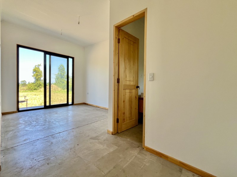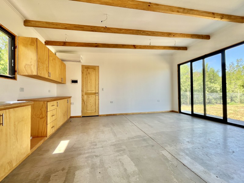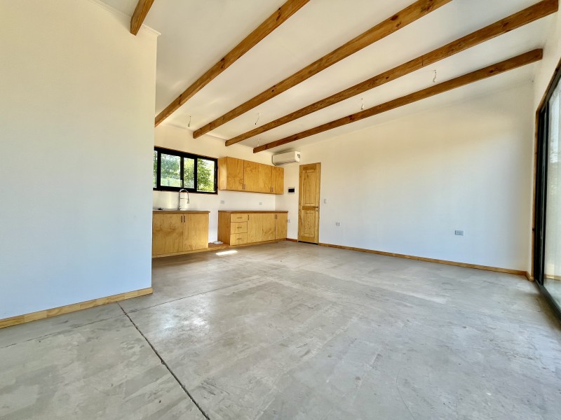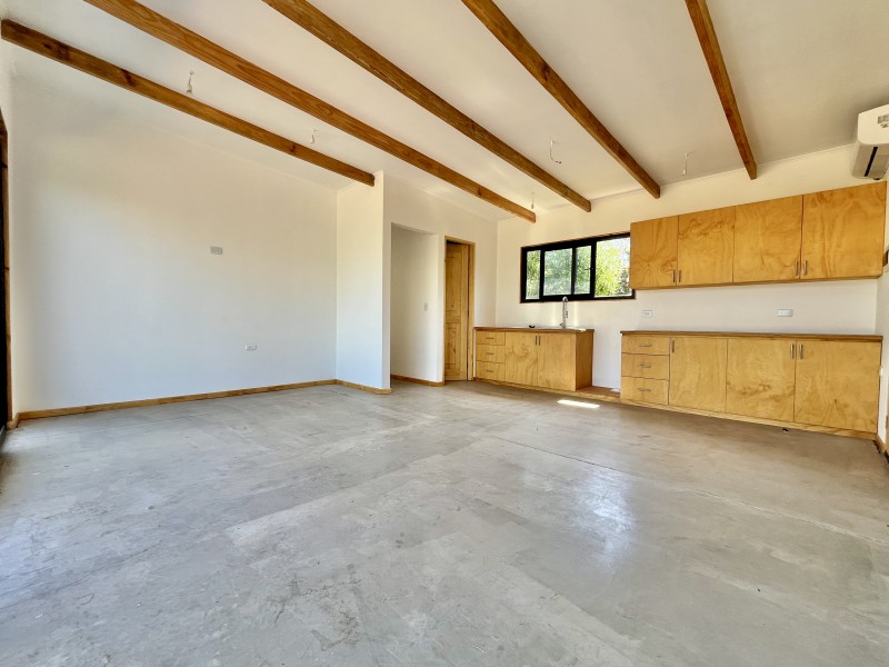 Pisos de cemento afinado, ventanas termopanel, puertas de madera, techos de doble altura, un equipo de aire acondicionado frio/calor.