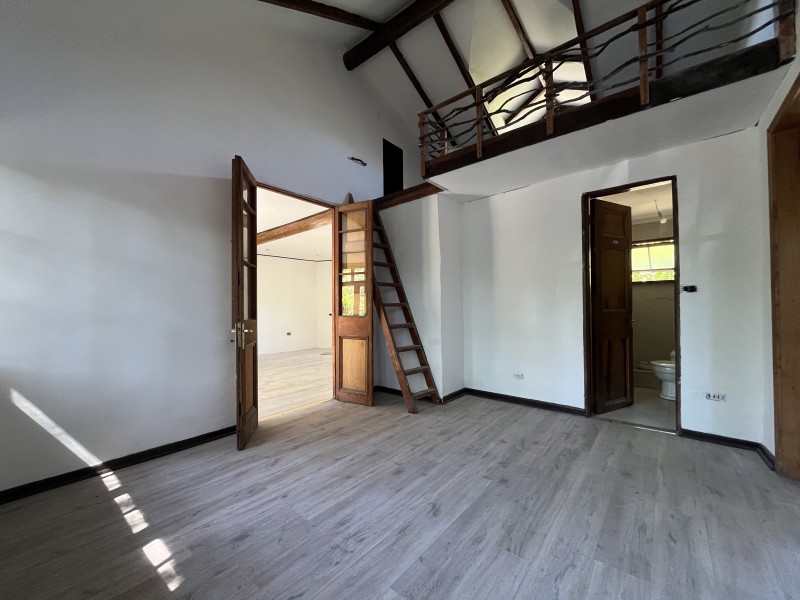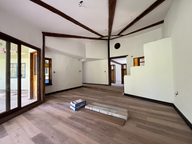 Hall de acceso, living con techos de doble altura y vigas a la vista, comedor con cocina integrada con muebles nuevos, sala de estar, altillo, 5 dormitorios, el principal en suite con walk in closet, 2 baños completos compartidos con los demás dormitorios, construcción de adobe moderno (antisismico) y con maderas de demolición.
