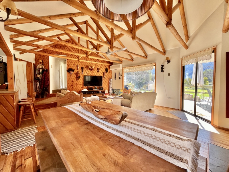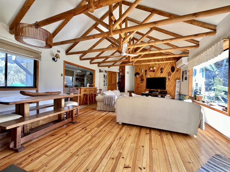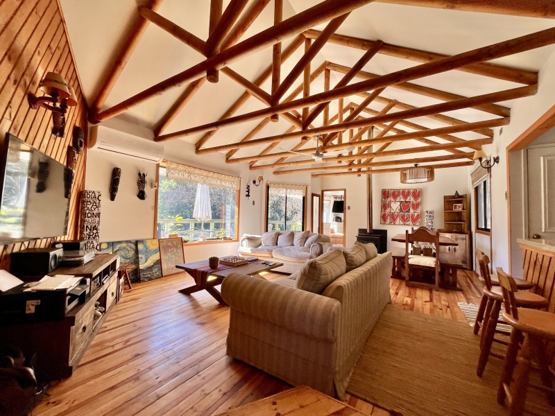 Hall de acceso, amplio living comedor, vigas a la vista estufa a combustión lenta a leña, un equipo de aire acondicionado y salida a terraza, cocina integrada remodelada completamente equipada, con horno empotrado, encimera, extractor, lavavajillas, refrigerador, 3 dormitorios, el principal en suite, todos con salida a terraza, 1 baño completo compartido para otros dos dormitorios.
