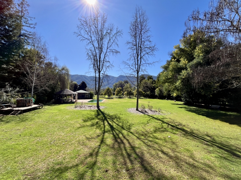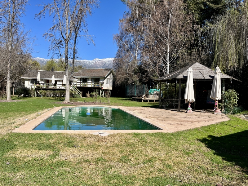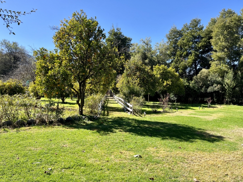 Jardín completamente formado y consolidado con riego automático, piscina con pérgola, hot tub, quincho completamente equipado con parrilla, mesón y lavaplatos, 2 baños exteriores para quincho y piscina, bodega, gallinero o canil, sector de frutales, huerto, gimnasio o sala multiuso con zona de lavado, estacionamiento techado para 3 autos.