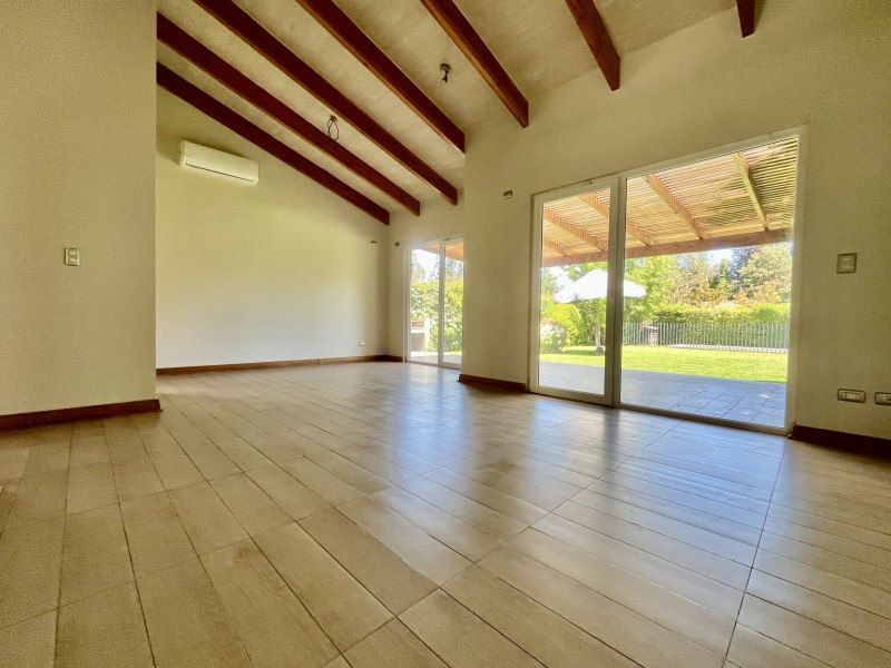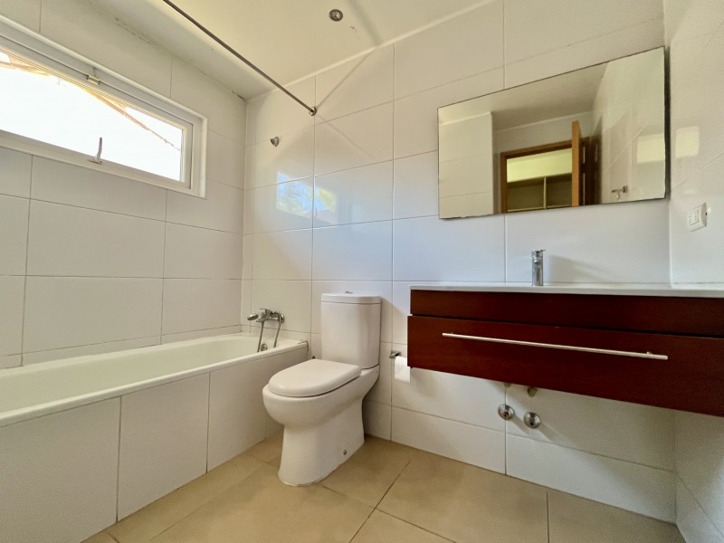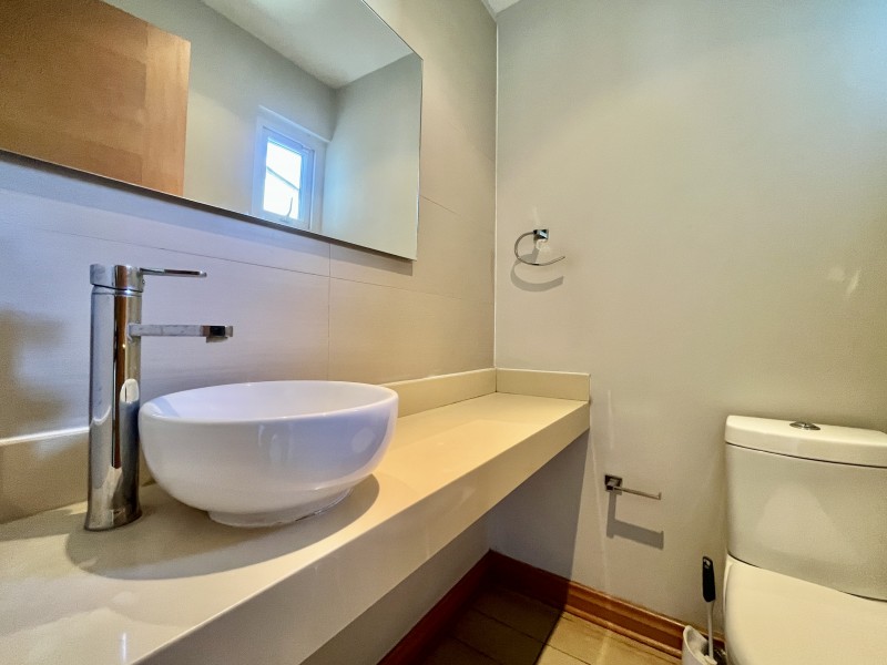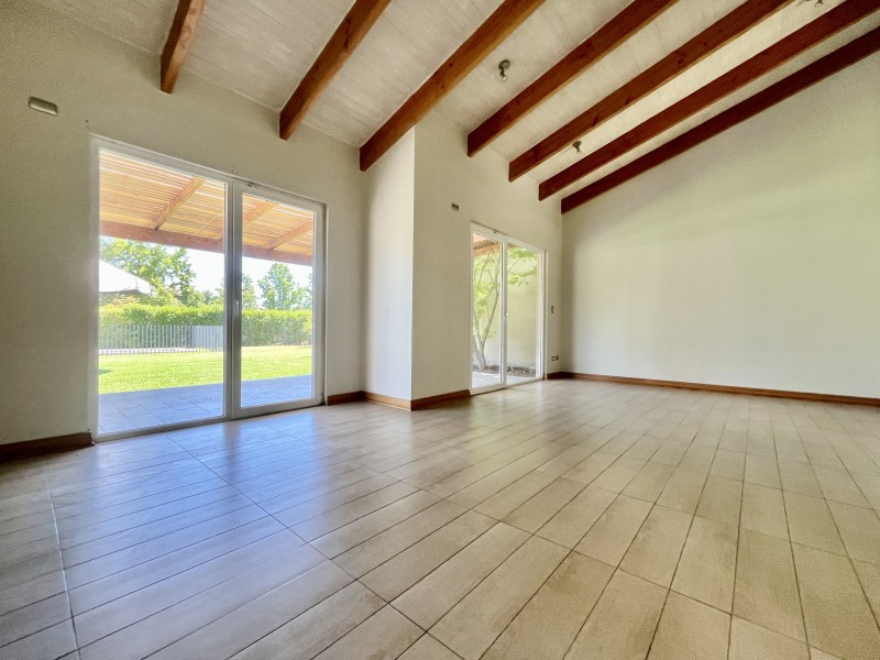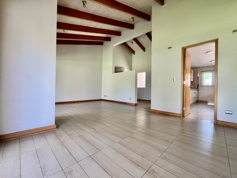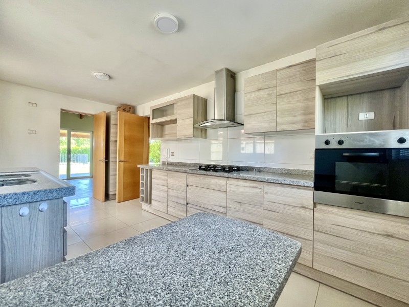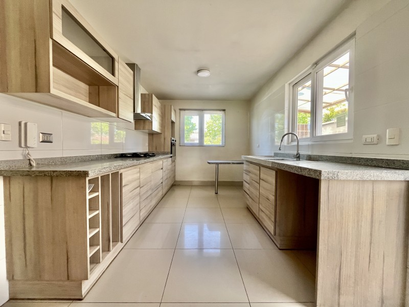 Hall de acceso, baño de visitas, living comedor con techos de doble altura y vigas a la vista, salida a terraza techada de estructura firme. Cocina completamente equipada y amoblada, encimera, campana y horno. Lavadero exterior techado, baño de servicio completo.