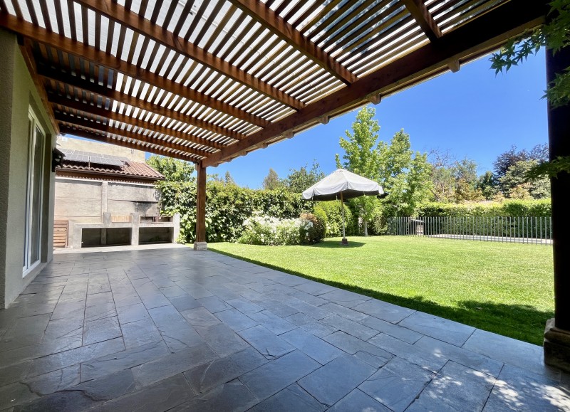 Jardín formado con riego automático, piscina con filtro funcionando, reja con puerta, terraza techada, parrilla en obra, bodegas en terraza lateral.