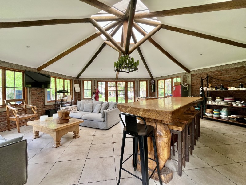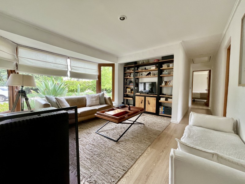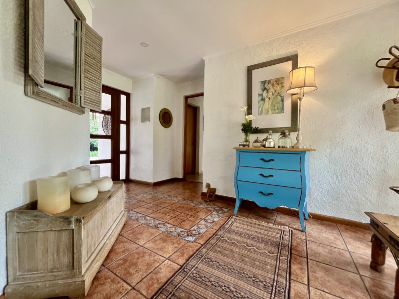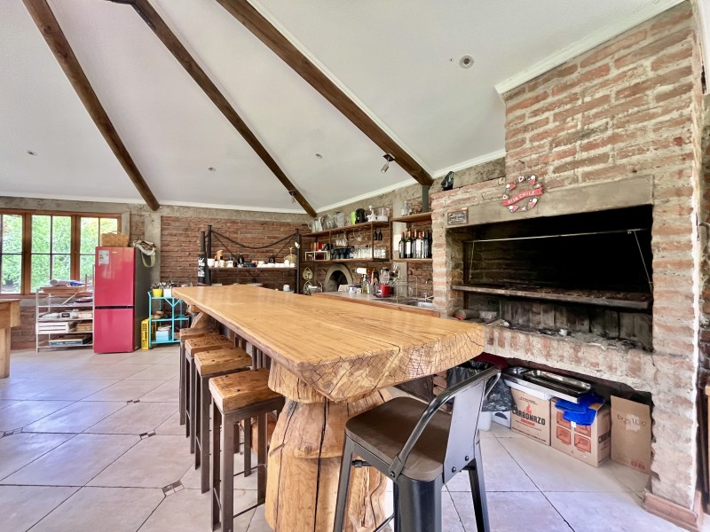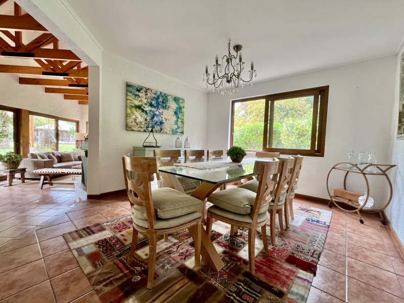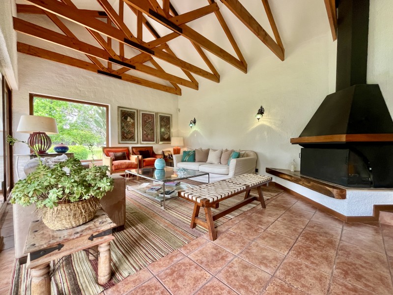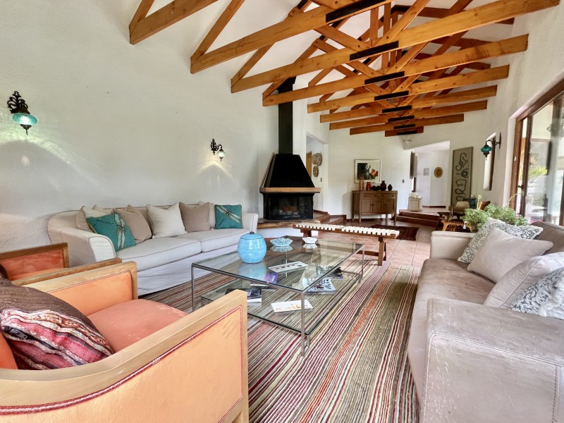 Hall de acceso con vista al jardín, living en desnivel de dos ambientes, chimenea, vigas a la vista y salida a terraza techada, comedor independiente, cocina amoblada y equipada con isla central, lavadero, dormitorios y baño de servicio, patio de servicio exterior techado.