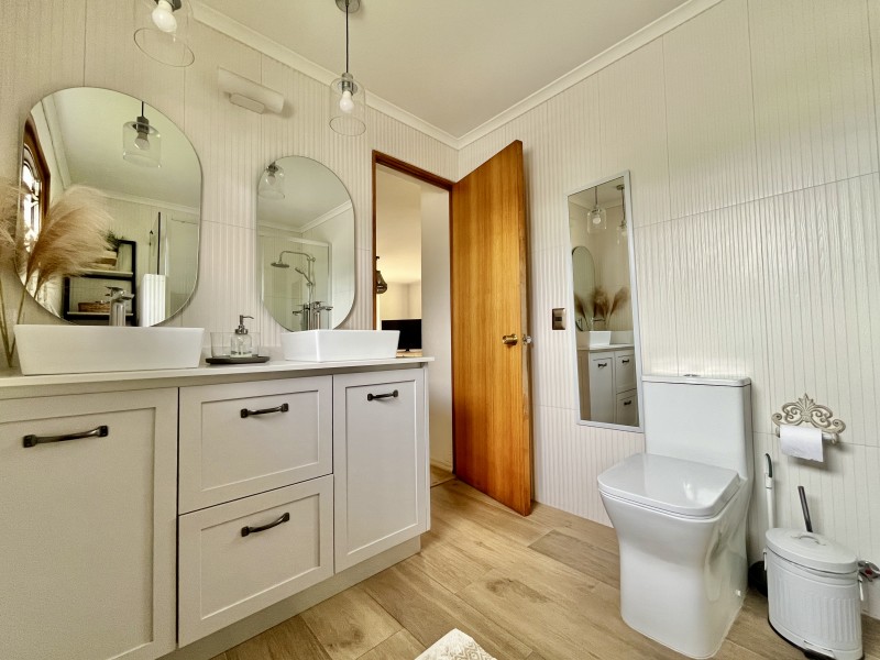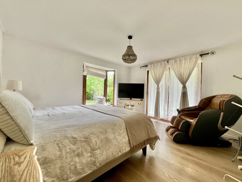 Ventanas termopanel, pisos de cerámica en recibos y cocina, porcelanato baños, piso flotante en dormitorios, calefacción por estufa a pellet y chimenea.