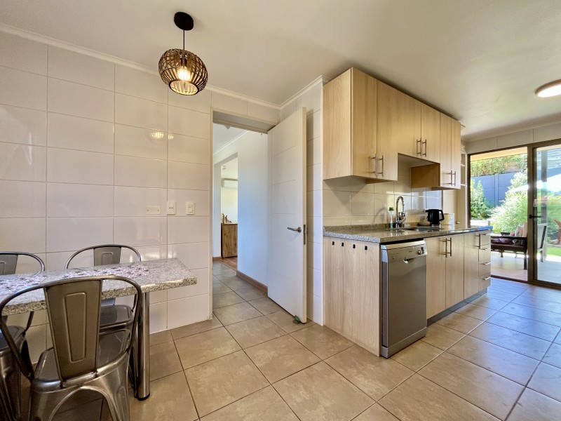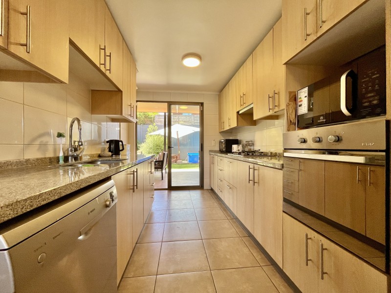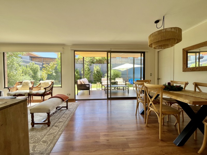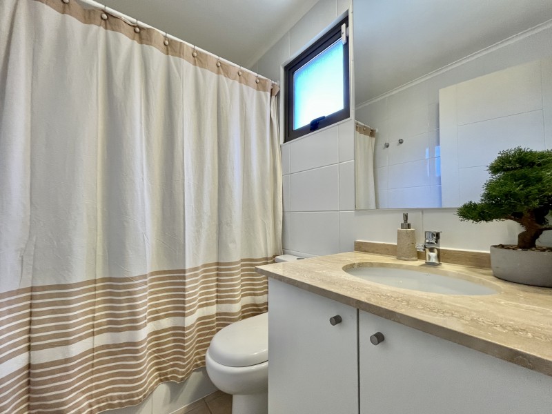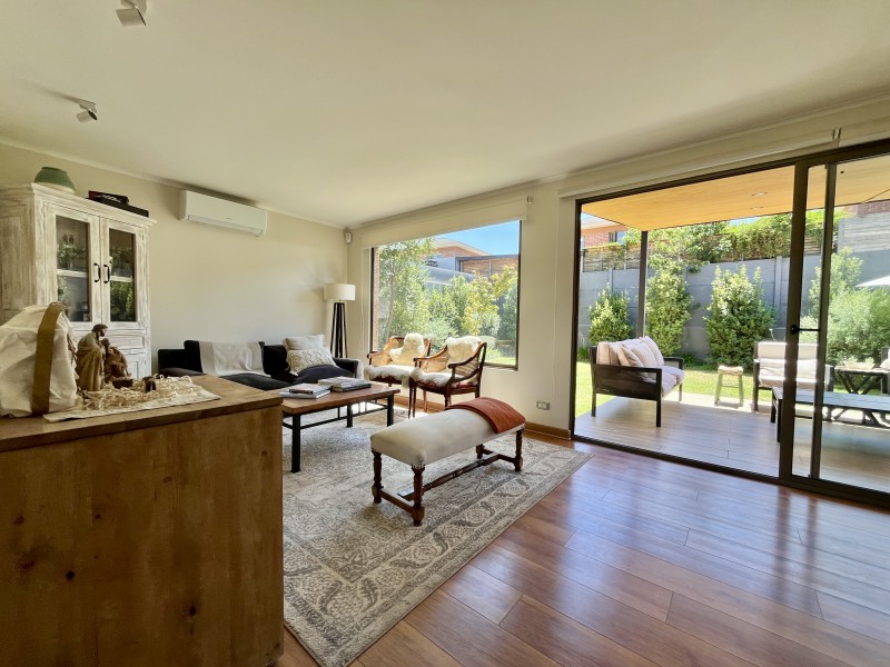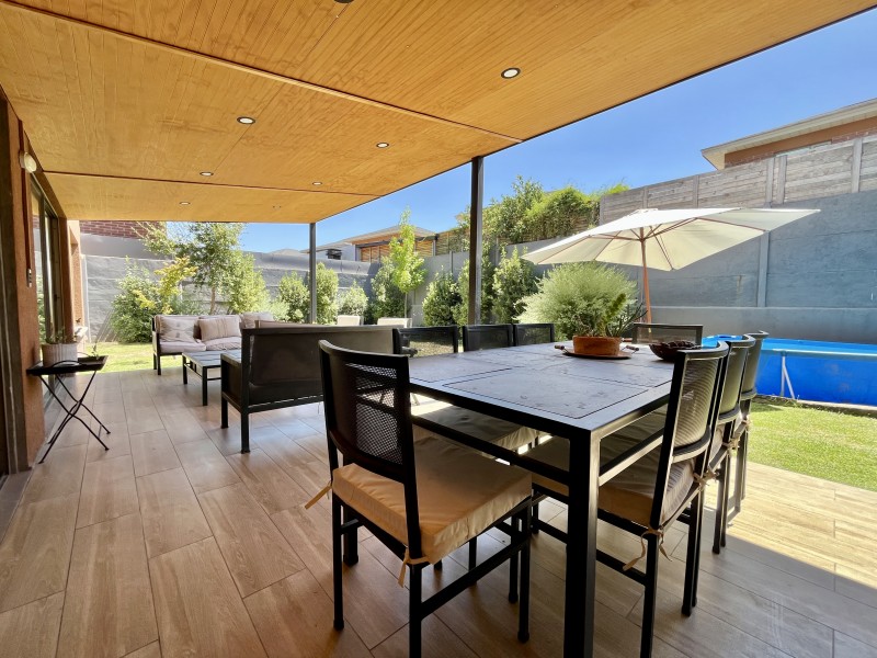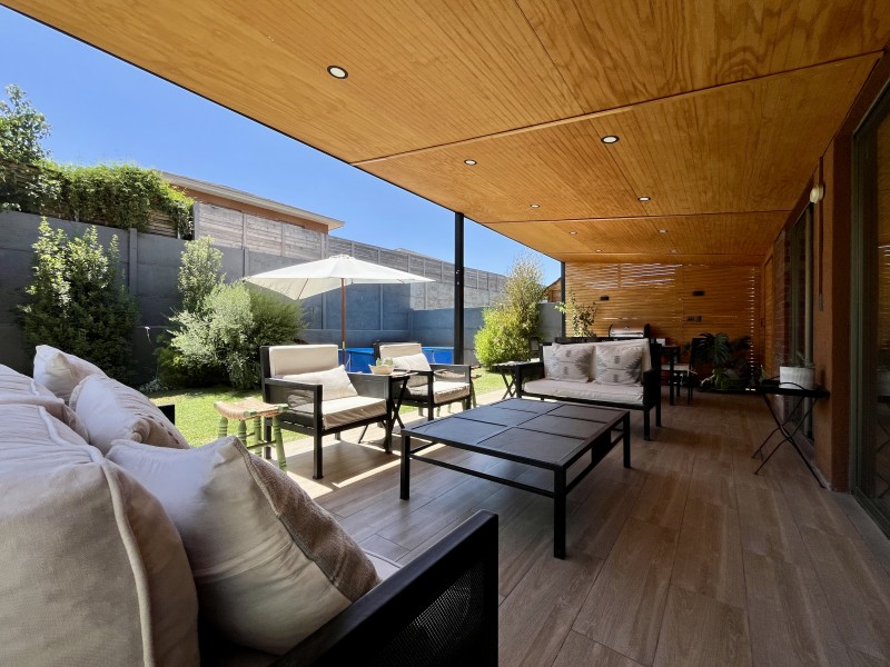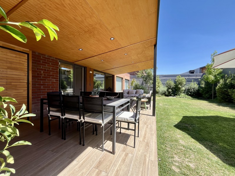 Jardín formado con riego automático, terraza techada con sector de living y comedor, zona de fogón, estacionamiento descubierto para 2 autos.