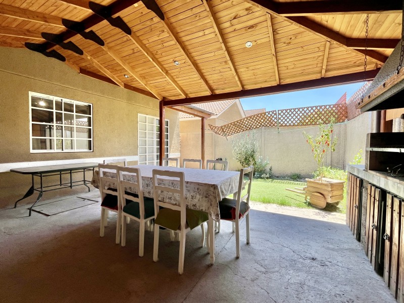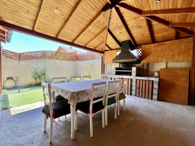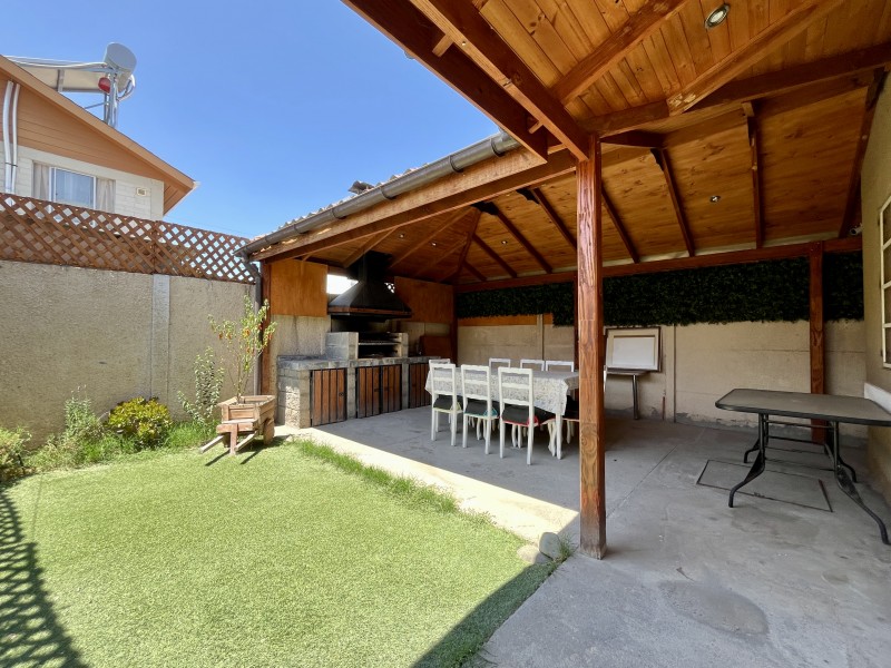 Terraza techada con quincho integrado, pasto sintético y jardineras , ante jardín formado con pasto y plantas ornamentales, estacionamiento descubierto para un auto